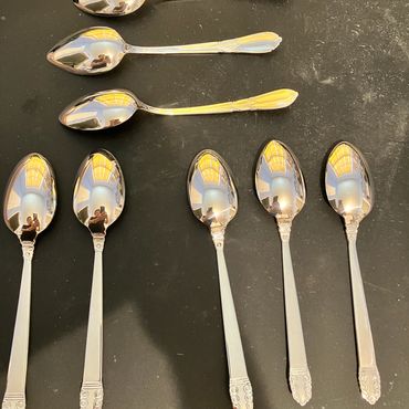 Flatware antique or other, Butter Knives, Individual Knives, Forks, Teaspoons, Tablespoons, Soup Spoons, Berry Spoon, Carving Fork, Carving Knife, Cold Meat Fork, Gravy Ladle, Ladle (soup or punch), Pickle Fork, Pie or Cake Knife, Sugar Spoon.